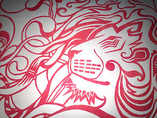 Voilà les premiers tirages de la 1er gravure d'une série de 2 autocollants (3 exemplaires sur 12). C'est un format A5, gravure sur linoléum, impression sur différents papiers (kraft couché, kraft non couché, papier jet d'encre classique). J'ai testé différentes teintes de rouge. Quelques petites retouches à prévoir, mais çà m'a l'air bon à tirer... Hop hop hop..